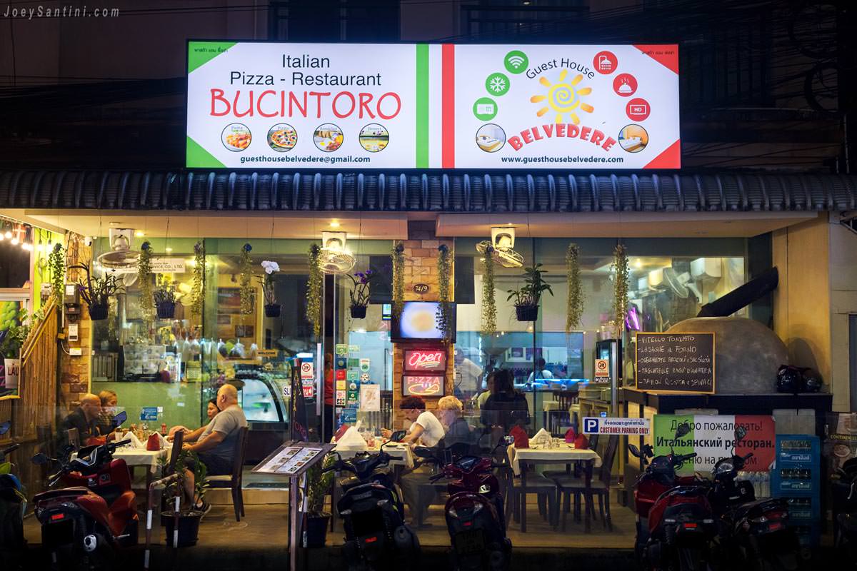Bucintoro is an Italian restaurant and pizzeria located in Soi Banzaan in Patong, Phuket, known for its traditional Italian cuisine, including wood-fired pizzas and homemade desserts. Located just steps from the Banzaan Market, Jungceylon Shopping Mall and Bangla Road, the restaurant is popular with Italian guests who indulge in the excellent, value-for-money Italian cuisine prepared by the friendly Federico, the owner, who hails from the Rovigo province, Italy.